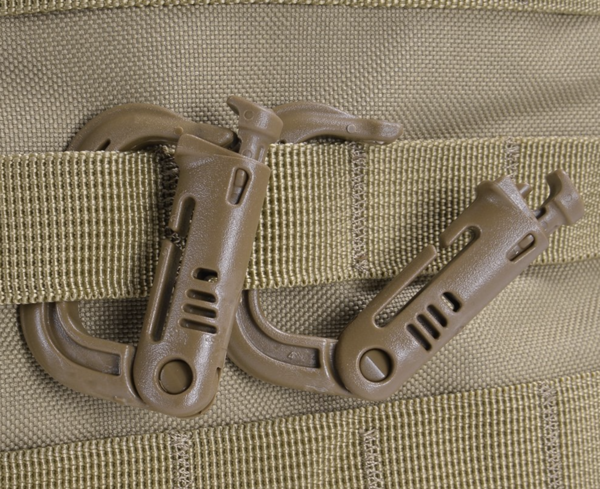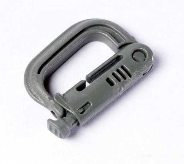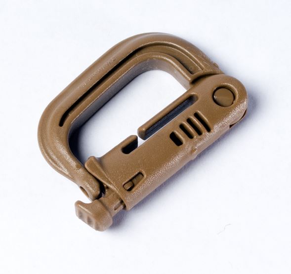 Kunststof carabiner welke de metalen variant kan vervangen in sommige gevallen, gemaakt van GhillieTex, met een gereduceerde IR-afgifte.