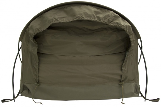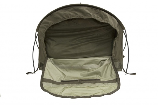 Compleet water- en winddichte en ademende Bivy bag met groter verhoogd hoofdgedeelte d.m.v. twee tentstokken, uitgerust met muskietennet en Gore-Tex Bi-Component-Membrane.