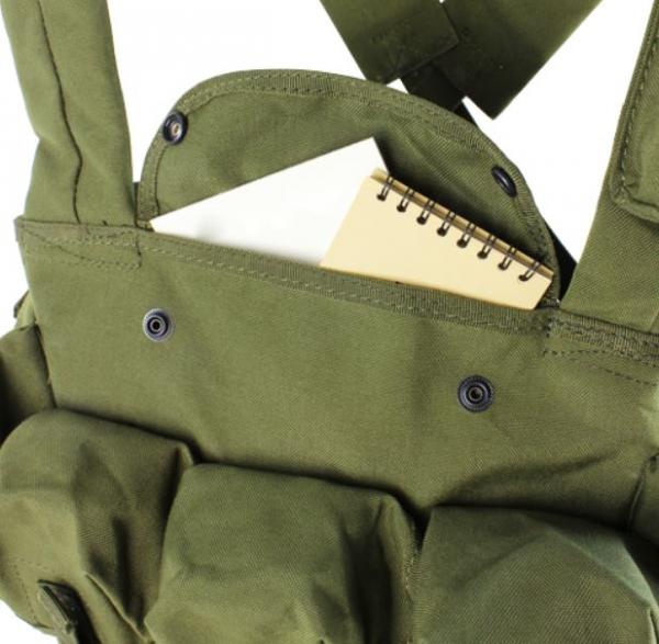 Chest rig met 7 opbergvakken en verstelbaar harnas. Drie houdertassen voor C7/C8/M4 houders (2 per houdertas), twee utility tassen, intern kaartenvak, extra tasje op de linker schouderband. Verstelbaar in de maat M t/m XL.
