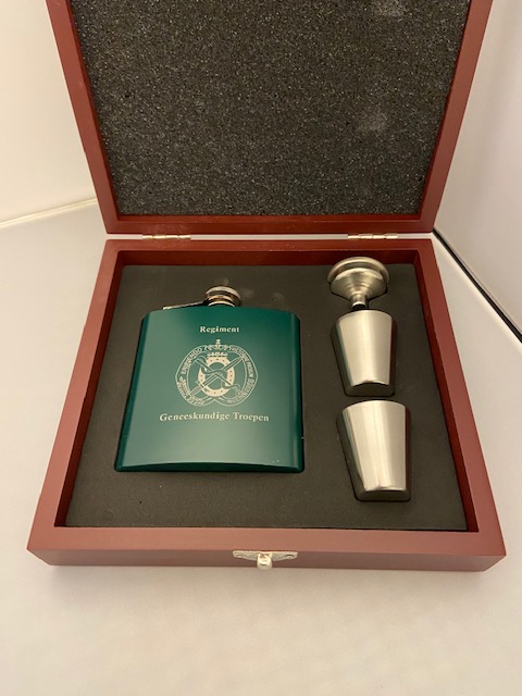 Roestvrijstalen heupfles met Korps embleem. Wordt geleverd met 2 kleine bekers en vuldop. De heupfles wordt gepresenteerd in een chique houten doos met uitgesneden foam.