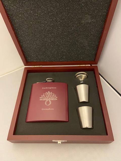 Roestvrijstalen heupfles met Korps embleem. Wordt geleverd met 2 kleine bekers en vuldop. De heupfles wordt gepresenteerd in een chique houten doos met uitgesneden foam.