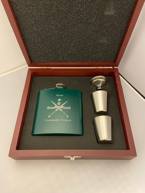 Roestvrijstalen heupfles met Korps embleem. Wordt geleverd met 2 kleine bekers en vuldop. De heupfles wordt gepresenteerd in een chique houten doos met uitgesneden foam.