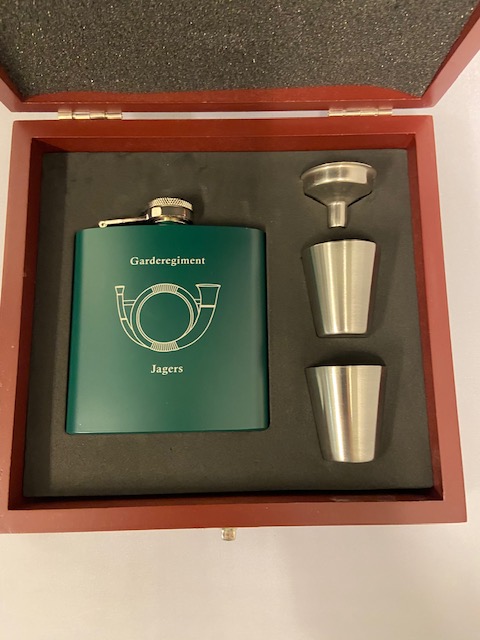 Roestvrijstalen heupfles met Korps embleem. Wordt geleverd met 2 kleine bekers en vuldop. De heupfles wordt gepresenteerd in een chique houten doos met uitgesneden foam.