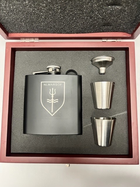 Roestvrijstalen heupfles met NLMARSOF Embleem. Wordt geleverd met 2 kleine bekers en vuldop. De heupfles wordt gepresenteerd in een chique houten doos met uitgesneden foam.