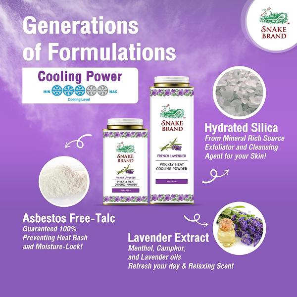 Essential oils camphor and menthol are key ingredients, with menthol providing the skin cooling properties. Snake Brand powder does not enter the body, but instead provides a fine protective coating above the skin, without blocking pores like creams or lotions do. The cool sensation sends a message to your body to slow down the production of sweat. Together with the super absorbent properties of fine talcum in Snake Brand powder, these ingredients combine to reduce sweat and friction, leaving you feeling drier, cooler and more comfortable within minutes.
