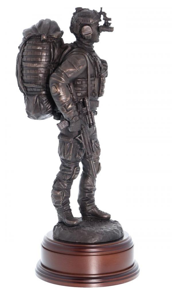 A military statuette of a Special Forces Trooper with his kit preparing for departure on an Operation.