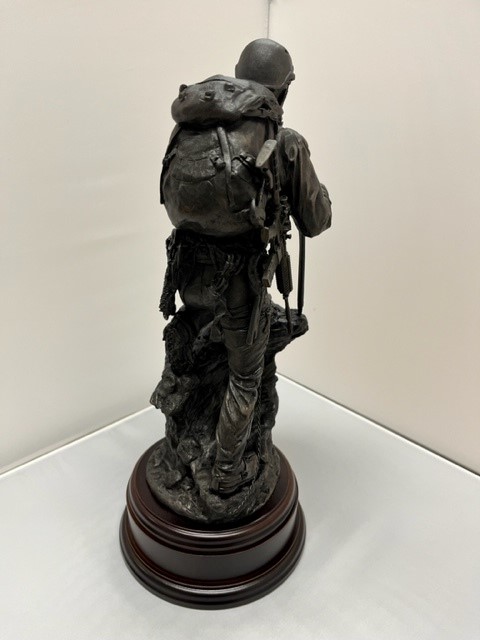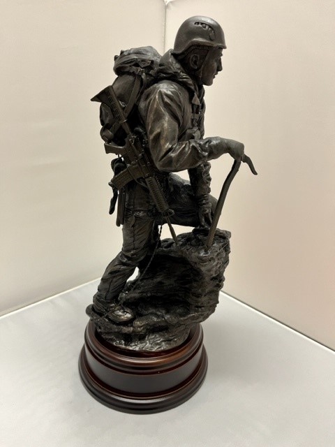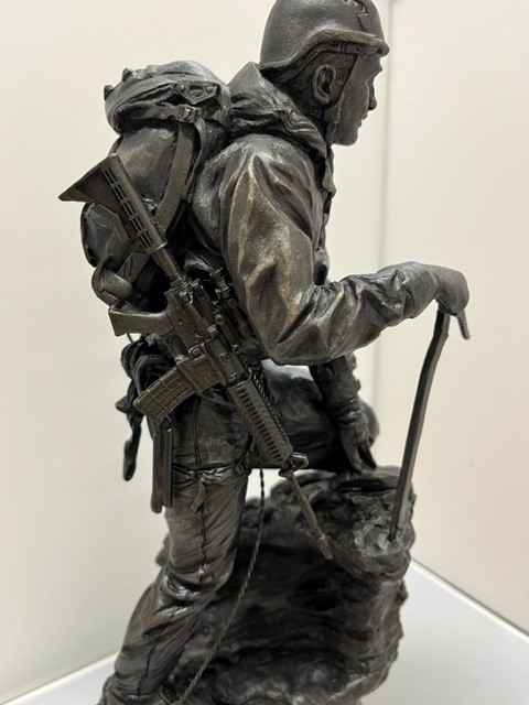This is the cold cast bronze 12" Scale Alpine Mountaineering sculpture. Fully equipped for a tough ascent he is climbing a rock face wearing helmet, harness, crampons and carrying an ice axe. This statue makes a great gift for anyone who loves to climb summits, or as a reminder of a particular challenging climb.