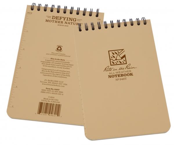 All-weather notebook, voorzien van kunststof kaft, watervast papier en spiraalgebonden. Verkrijgbaar in de kleuren: Olive (OD), Black (BK) & Tan (TAN).