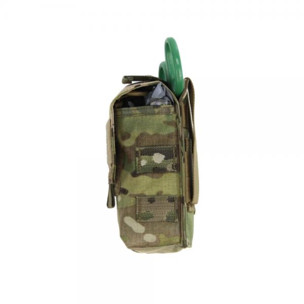 Both sides of the pouch have additional external webbing for attachment of extra CATs or smaller pouches etc. The lid of the pouch has a Velcro square for attachment of First Aid patch etc. Warriors IFAK occupies only 2 rows of MOLLE webbing so it can be mounted on any amour carrier, chest rig or fits perfectly on the rear of Warriors PLB Belt, Gunfighter Belt or Frag Belt.