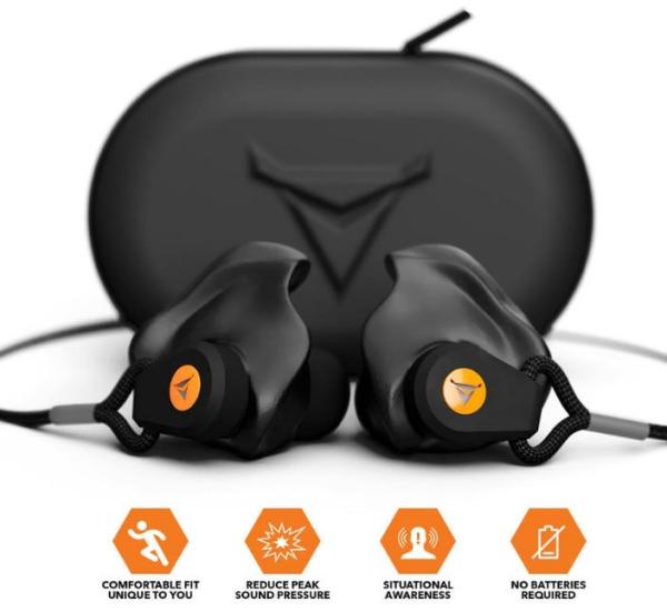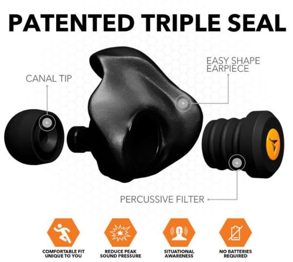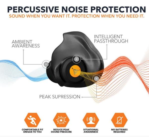 Unlike traditional earplugs, percussive filters actively reduce sound waves to safe levels, while allowing for full situational awareness.