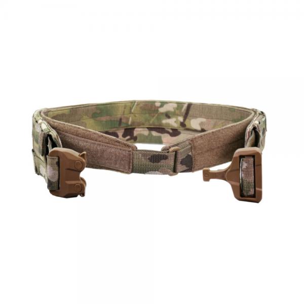The second part of the system is made up of a low profile MOLLE belt covered in 2 rows of webbing, this belt has a row of hook Velcro on the inside which marries up to first belt, it is then secured by way of a removable belt and composite GT Cobra buckle. This belt can be removed at any time and substituted for a Riggers style belt if required.