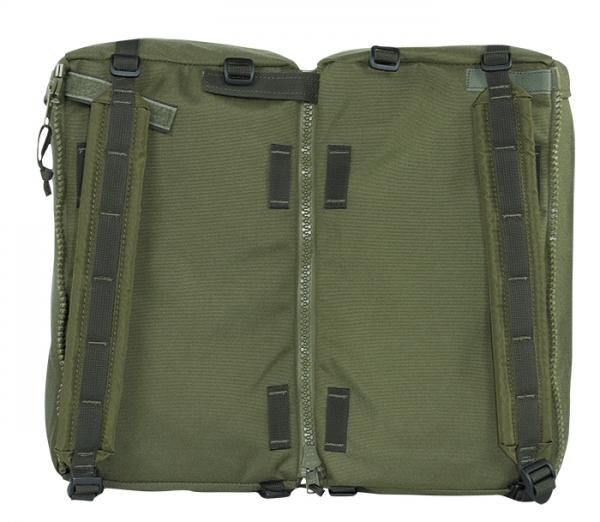 Crusader 90 + 20 FA stands for front acces. Being part of the MMPS Family it shares the same modules, offering the same flexibility. The front acces allows the operator to quickly pull out equipment fromt the lower part without having to take out other equipment stowed on top. Loops inside on the back panel can optionally be used to attach a MMPS radio pad, keeping the radio nicely stowed against the inside back of the backpack, Antenna, cables etc. can be fed through openings at the top of the backpack body.