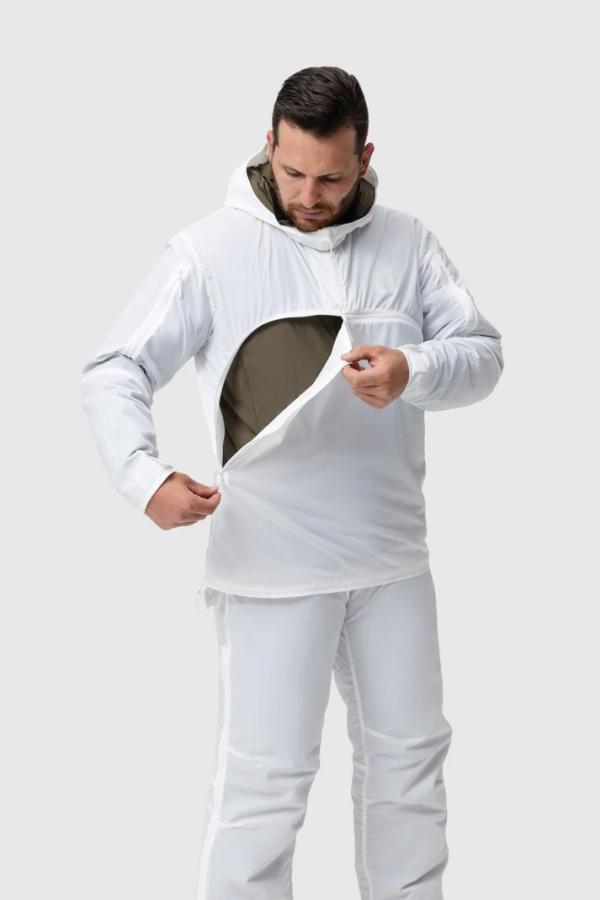 Quiet, featherweight, weather shedding and packable concealment for arctic, subarctic, or urban conditions that allows for kit access underneath.