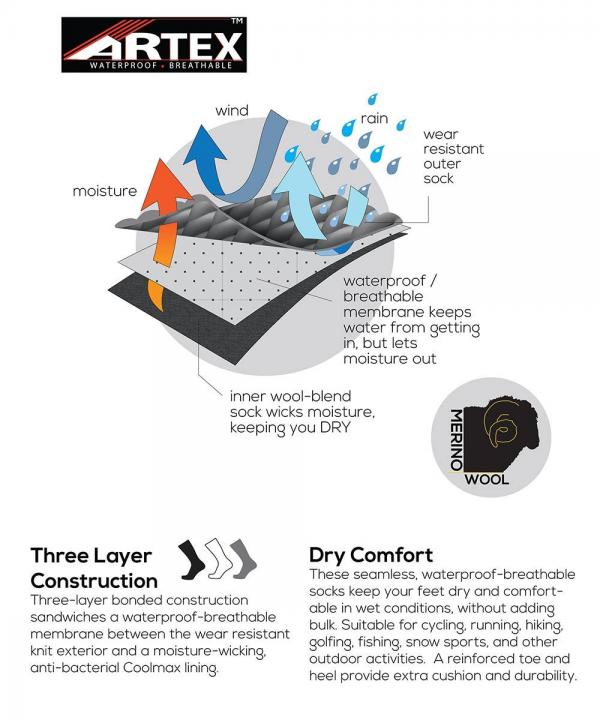 3-layer construction: Wear resistant knit exterior, a seamless waterproof Artex membrane, and a moisture-wicking Merino Wool-blend lining