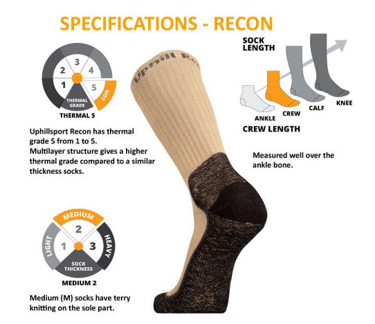 The foot part of the Recon Sock has a fitted heel and elastane grip on the arch -This improves support mid foot, and adds comfort by keeping the sock in place, wrinkle free.
