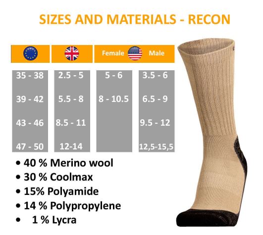 Desert Recon Socks are made with a 4-layer Drytech structure – Different layers transfer moisture out and prevent blisters - This guarantees great breathability and moisture control.