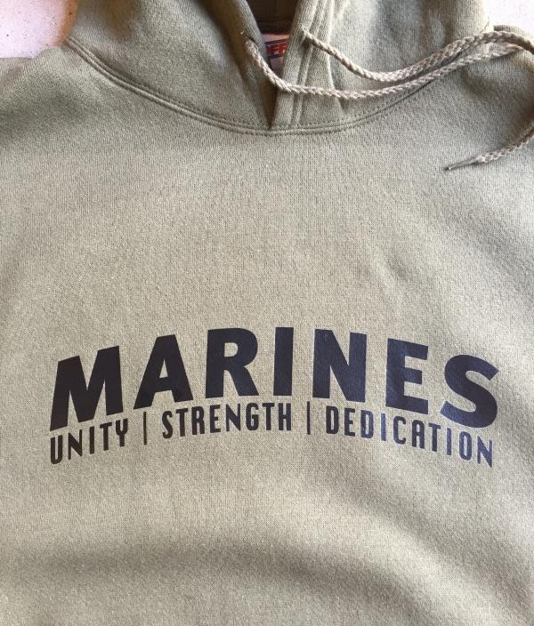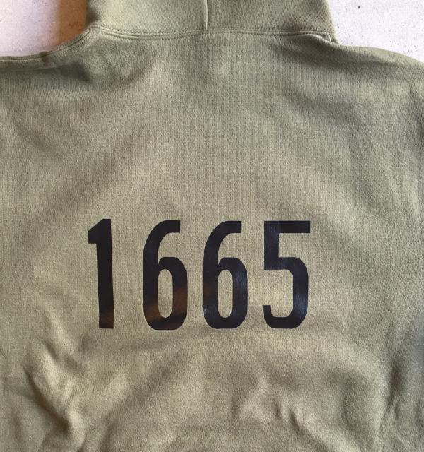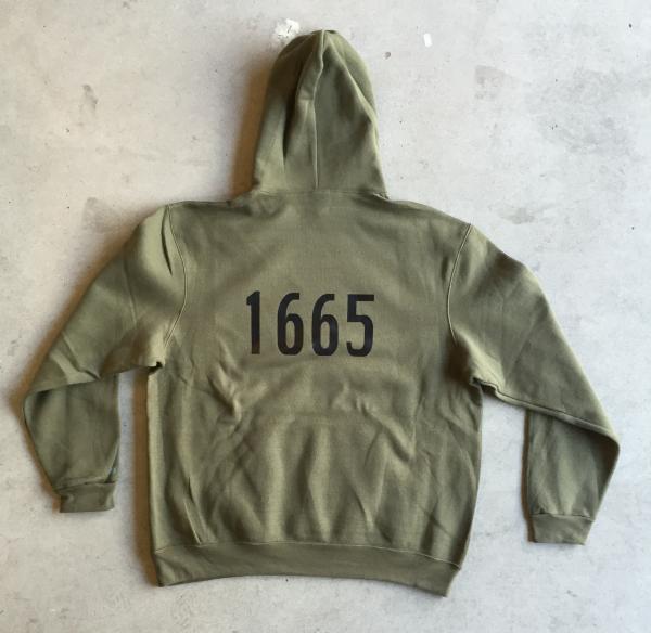 Sweatshirt met capuchon en steekzakken, bedrukt met de Korpswaarden aan de voorzijde en 1665 aan de achterzijde.