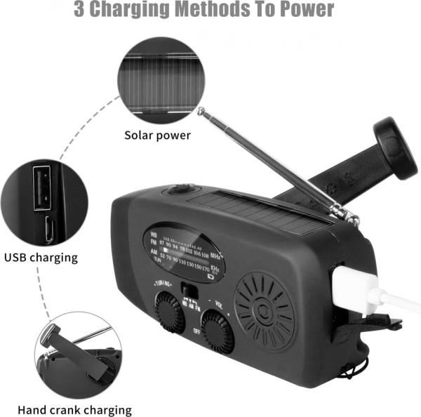 Deze noodradio is een alles in 1 draagbare radio met meerdere, praktische functionaliteiten. De radio kan als zaklamp of powerbank gebruikt worden. De draagbare radio kan op 3 manieren opgeladen worden: op zonne-energie, zelf opwinden of met de meegeleverde USB-kabel. Met de radio kun je zowel AM als FM radiozenders ontvangen. De AM range loopt van 520 tot tot 1600 KHz en de FM range loopt van 87 tot 108 MHz. Gebruikt de radio gemakkelijk als powerbank dankzij de meegeleverde USB-C kabel. Ook kun je de kabel gebruiken om de radio gemakkelijk op te laden. Ideaal is de ingebouwde zaklamp. De radio heeft een IPX3 codering en is dus spatwaterdicht. Je kunt hem dus in alle weersomstandigheden gebruiken. Ook is de radio niet groter dan een Smartphone en kun je hem gemakkelijk overal mee naartoe nemen. Een handig apparaat voor als je gaat kamperen, wandelen, als je op reis bent, maar ook voor echte noodsituaties!