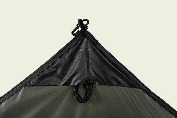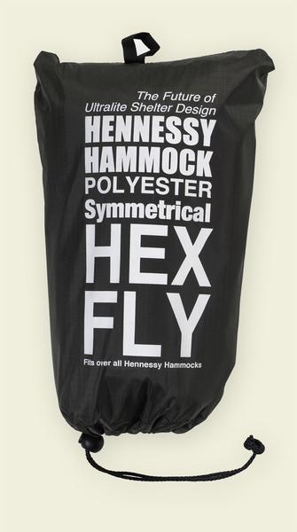 This PU-coated polyester ripstop rainfly works with all Hennessy Hammock models providing generous protection from wind and rain. Can be angled out to provide a large covered area for cooking or relaxing or can be staked down near the ground on both sides of the hammock. The "Hex" Fly can also be used on its own. Because of the wind load, this fly should be tied directly to trees with strong polyester cords provided. Two tie outs on each side.