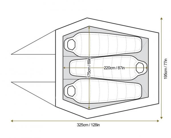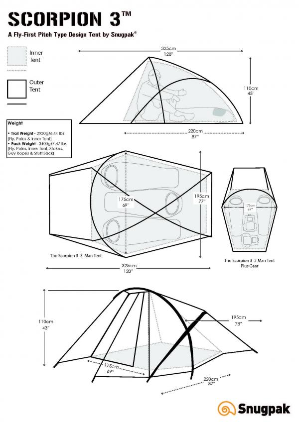 • Pack Weight - 3.4kgs (Fly, Poles, Inner Tent, Stakes, Guy Ropes & Stuff Sack)
