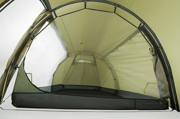 This airy tent is ideal for hot climate zones, since the two sides can be rolled up. The mosquito net inner tent also protects against attacks when using full ventilation. The extended front arch turns the vestibule into a practical awning, while the shorter rear arch saves materials and thus also weight.