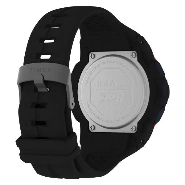 De timex ufc rush is uitgerust met een quartz uurwerk en een hars kast. De zwart wijzerplaat is gehuisvest in een zwart gekleurde kast en een zwart siliconen band. Het horloge wordt geleverd in een originele doos.