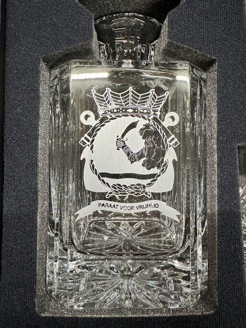 Een vierkante karaf van 24% loodkristal en 2 glazen gegraveerd met Korps embleem. De set wordt gepresenteerd in een chique giftbox.